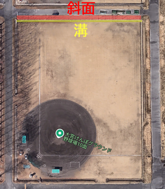 レフト側は、溝を越えて土手の斜面やさらにその上の道路に着弾したらホームラン。溝より前に着弾し、土手の斜面を越えた場所まで行ったらエンタイトルツーベース。それ以外はフリー(溝より前に着弾し、溝に落ちたり、斜面に当たって戻ってきた場合も含む)。